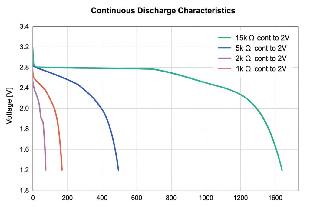 Again, it can be argued that short duty cycle pulsed operation will still yield a much longer lifespan, but if we imagine an again not unreasonable 25mS pulse duration, this 5 minute test (to under 2.6v) only corresponds to 12000 discrete pulses. Possibly OK for a carefully designed “push-button” fob (which is almost always off), but not for something like a low duty cycle “node” such as an environmental monitor, or for an alarm, where the power drain is constant