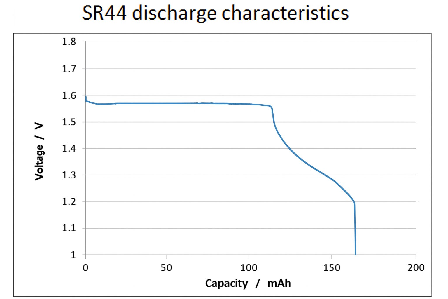 | Lets repeat that test with a pair of SR44 silver oxide cells (RS own brand, rated at 160mA/Hr) Voltage as new, negligible load is 3.24v (just over 1.6v per cell) Apply a 100R load (30mA at 3v, as representative of a typical narrowband 10mW transmitter) and the voltage drops to 3.03v immediately. This again suggests an initial internal resistance somewhere around 12 ohms After 1 minute the on-load voltage has fallen to 2.86v After 5 minutes it is still 2.85v (the discharge curve of silver oxide cells is almost flat) After the test, the open circuit voltage is 3.02v, but has risen back to 3.16v after an hour |